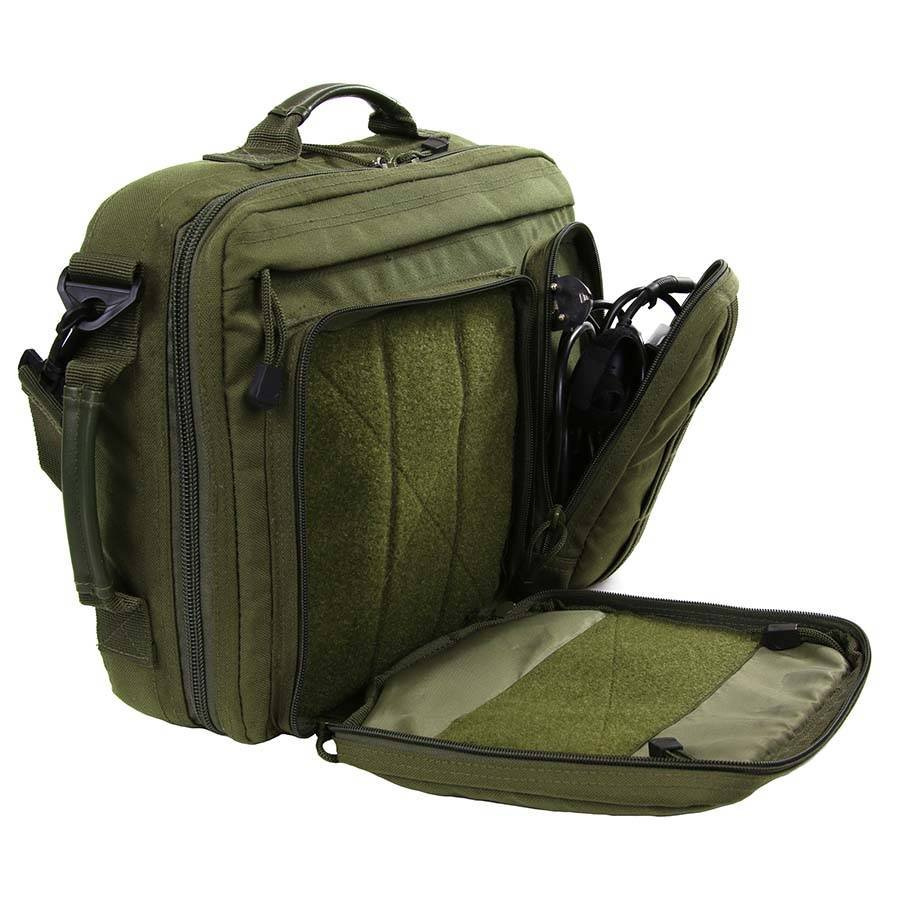 Auf der Außenseite befinden sich drei unterschiedlich große Taschen. Die kleinste von ihnen hat eingenähte MOLLE- / PALLS-Standardriemen und bietet Platz für ein Ladegerät und Laptop-Zubehör. Die zweite größere Tasche ist mit einem Klettverschluss ausgestattet, um einen Organizer aus dem Hauptfach zu befestigen. Die dritte flache Tasche ist für den Transport von A4-Dokumenten vorgesehen.