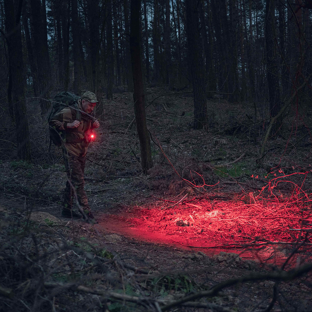 Die leistungsstarke LED gibt eine Lichtleistung von bis zu 1100 lm und eine Reichweite von 98 Metern in weißer Farbe ab. Sie verfügt über zehn differenzierte Leuchtmodi - vom Signal- bis zum Turbomodus. Bedient wird die Taschenlampe mit einem gelben Knopf. Hält man den Knopf gedrückt, wechselt die Lichtintensität, ein schneller Doppelklick zwischen weißem und rotem Licht. Das rote Licht ist weniger geeignet, um Insekten anzulocken.