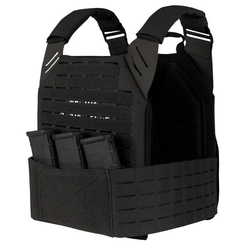 Aus strapazierfähigem 500D Cordura gefertigt, ist sie mit lasergeschnittenen Befestigungsgurten ausgestattet, die die Weste leichter machen als ihre Konkurrenten. Der vordere Teil der Weste hat zwei Schnallen und ist mit einem Klettverschluss versehen, der es ermöglicht, zusätzliche modulare Paneele mit Taschen zu befestigen.