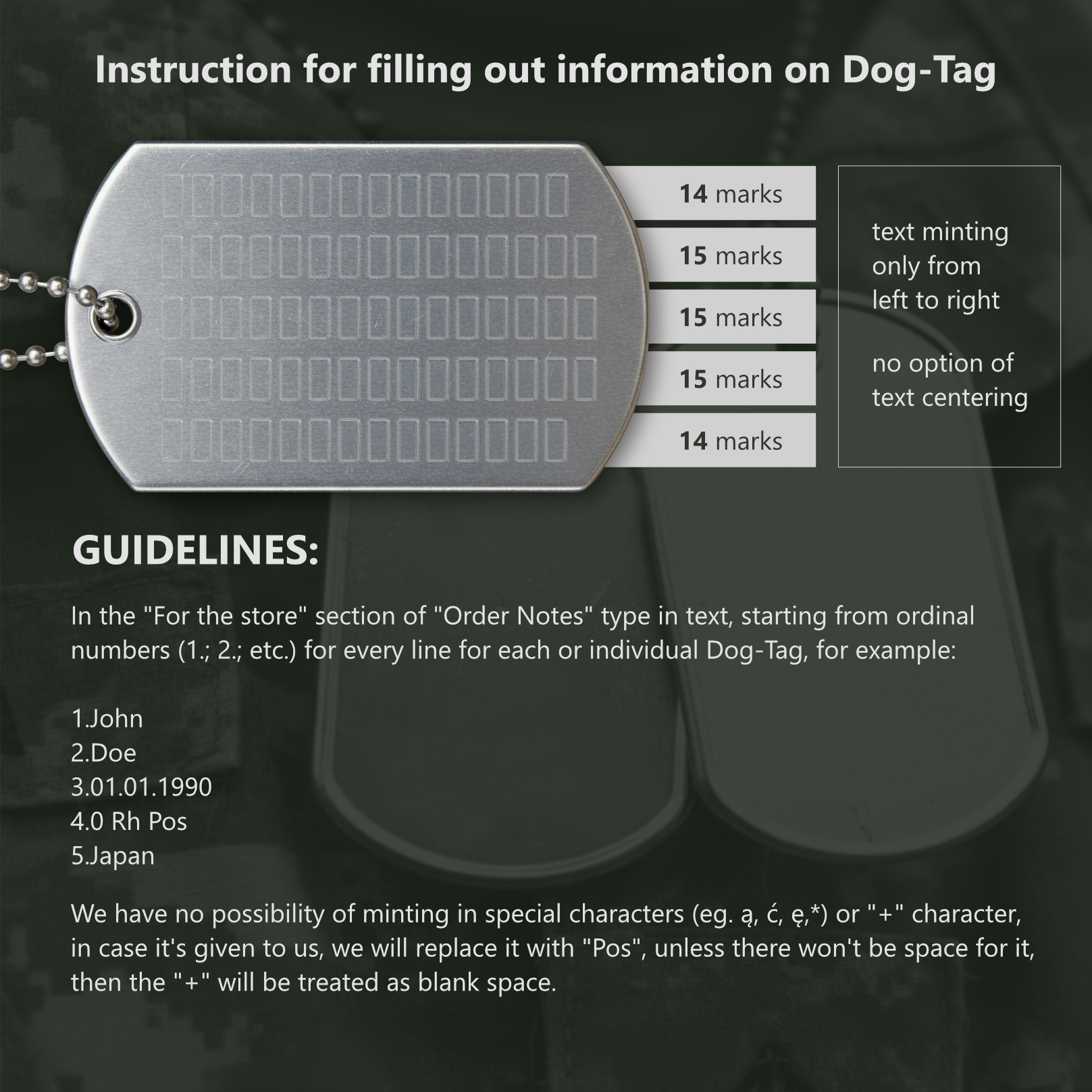 Dog-Tag der US-Armee. Sie wird üblicherweise von jedem Soldaten um den Hals getragen und ermöglicht eine effiziente Identifizierung, wenn es unmöglich ist, von einer Person Informationen zu erhalten. Die Marken sind aus silberfarbenem Aluminium gefertigt. Zum Set gehören Gummibänder zur Unterdrückung des Summtons und zwei Ketten, eine kürzere und eine längere. Das ganze Set ist in einer Papiertüte mit gedruckter Montageanleitung verpackt.