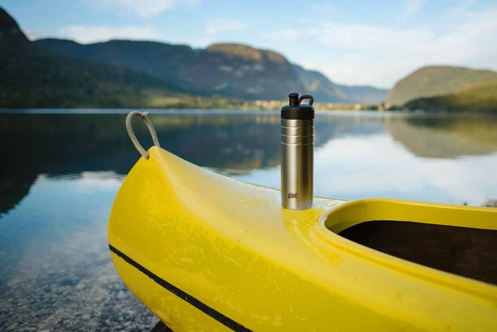 Eine Sportflasche aus Stahl, ausgestattet mit einem funktionellen Verschluss, wie bei Wasserflaschen, der mit einer Hand bedient werden kann. Es hat eine 60 mm breite Öffnung. Von außen ist es mit einer Silikonbeschichtung überzogen, die die Griffigkeit verbessert.