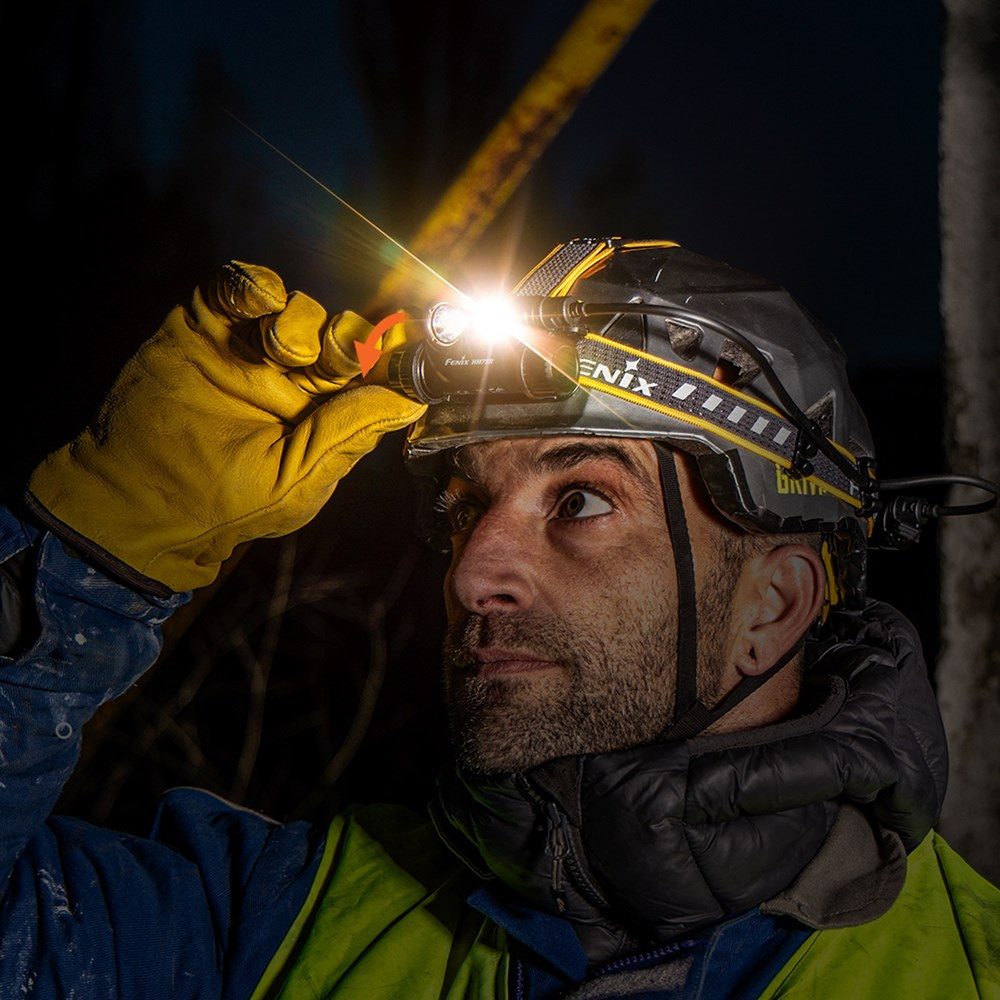 Die Stromversorgung erfolgt über einen wiederaufladbaren 18650-Akku, der über einen USB-C-Anschluss geladen wird und durch eine interne Dichtung geschützt ist. Zwei separate Bedienelemente - ein Modusschalter und ein Helligkeitsschalter - ermöglichen es Ihnen, die Taschenlampe zu steuern, ohne sie von Ihrem Kopf zu entfernen. Ein 90°-Neigungsverstellmechanismus ermöglicht es Ihnen, das Licht zu richten, ohne Ihre Körperposition zu verändern.