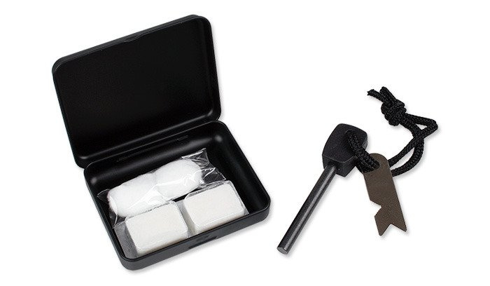 Beinhaltet einen Überlebensfeuerstein, zwei Wattebäusche und