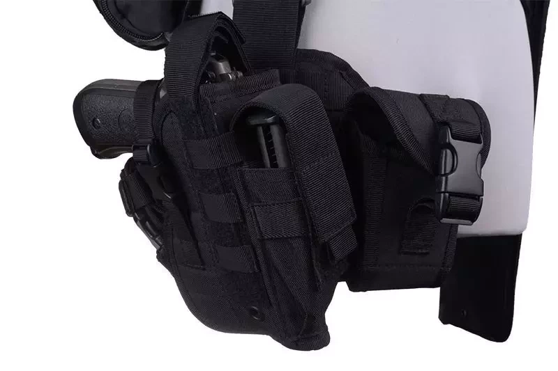 Die Oberschenkelplatte kann mit einem einzigen Riemen mit Fastex-Schnalle am Gürtel befestigt werden.Zum Lieferumfang gehören ein kleines Staufach (100 x 900 x 25 mm), ein Holster und eine Tasche für ein Pistolenmagazin.
