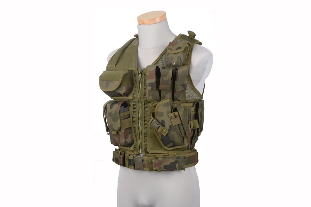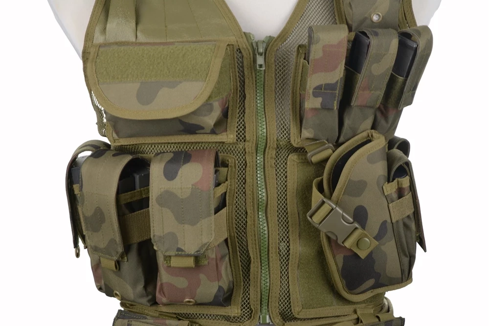 Die klassische taktische Weste KAM-39 wurde aus Nylon gefertigt. Sie wird mit einem Reißverschluss verschlossen. Die universelle Größe und die verstellbaren Seitenriemen und der Hüftgurt ermöglichen die Anpassung an die Maße des Benutzers.