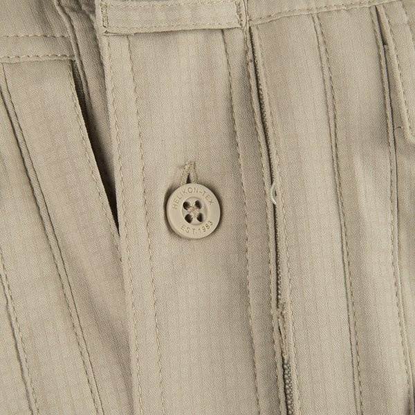 Defender Mk2 Tropical wird mit Knöpfen mit dezent durchbrochenem Helikon-Tex® verschlossen. Auf der Höhe der Brust befinden sich Taschen, die mit Klappen mit Klettverschluss befestigt sind, ihre anatomische Anordnung in einem Winkel erleichtert die Entnahme von Gegenständen aus ihnen. Unten befinden sich zusätzliche flache Taschen mit YKK® Reißverschlüssen, die von der Brückenseite aus geöffnet werden und das Verstecken wertvoller Gegenstände ermöglichen.