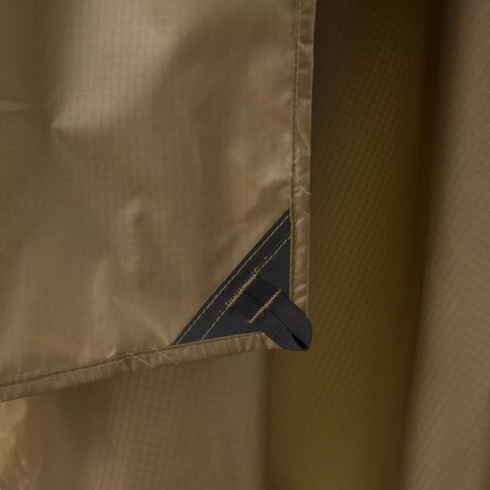 Der Poncho ist vollständig aus Ripstop-Polyester mit einer ausgeprägten Webart hergestellt. Alle Befestigungspunkte sind zum Schutz vor dem Zerreißen verstärkt worden. Das Cape wird mit einer Tasche mit eigenem Kordelzug geliefert, die es ermöglicht, den zusammengefalteten Poncho auch mit einem Wanderrucksack kompakt zu tragen.