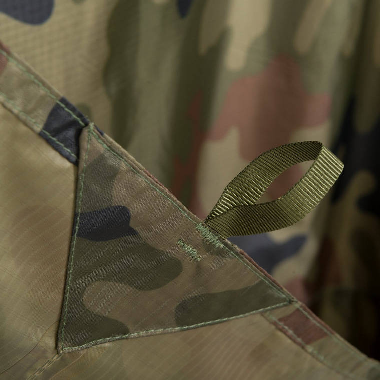 Kompaktes Schutzcape für Biwakierer. 19 Befestigungspunkte sorgen für eine fast unendliche Auswahl an möglichen Konfigurationen für alle Terrains und Klimazonen.