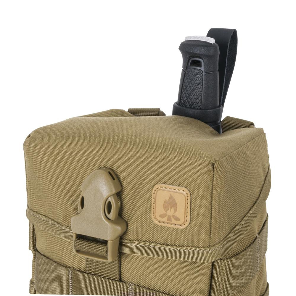 Die Hülse auf der Rückseite bietet Platz für eine Säge/ein Messer/eine Axt. Die Tasche ist so konzipiert, dass sie an einem Gürtel oder MOLLE/PALS-System befestigt werden kann.