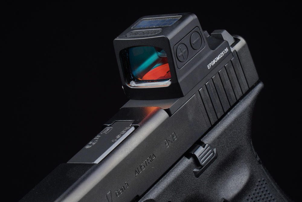 Ein Grünpunktvisier, das sich durch eine kompakte, geschlossene und niedrige Bauweise auszeichnet. Die Größe des Objektivs ermöglicht eine bequeme Beobachtung mit beiden offenen Augen, und die niedrige Montage ermöglicht die Verwendung mechanischer Visiere im Notfall. Es ist für die Montage auf der Holosun Serie K (modernisiert RMS) Platte geeignet.