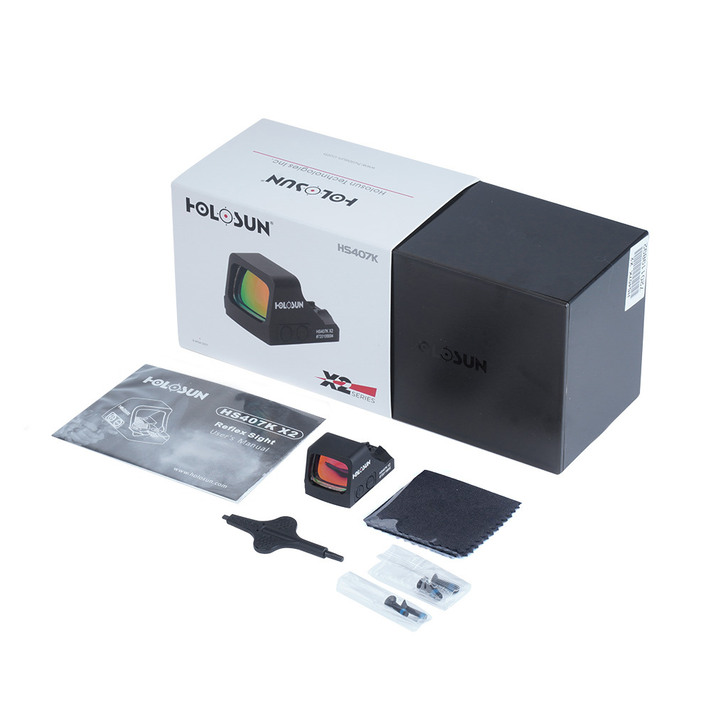 Das HS407K Miniatur-Kollimatorvisier in X2-Version von Holosun. Es profitiert von einer optimierten Gehäusegeometrie mit offenem Design. Ein 6 MOA Festpunkt, dessen Helligkeit eingestellt werden kann, ist für die Zielverfolgung ausgelegt. In Kombination mit einem Gehäuse aus Aluminium konnte ein Visiergewicht von 28 Gramm erreicht werden.