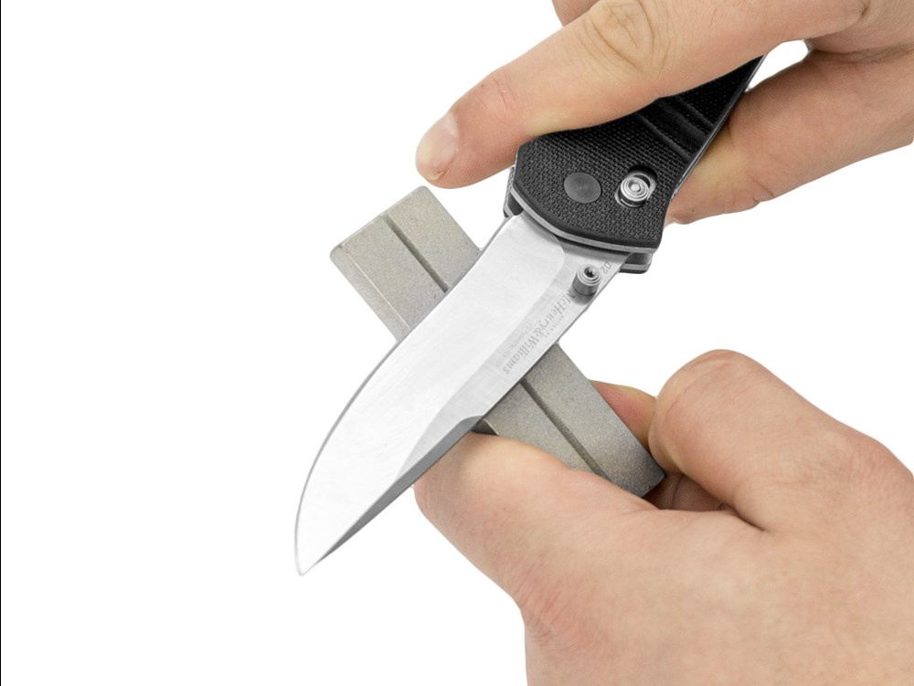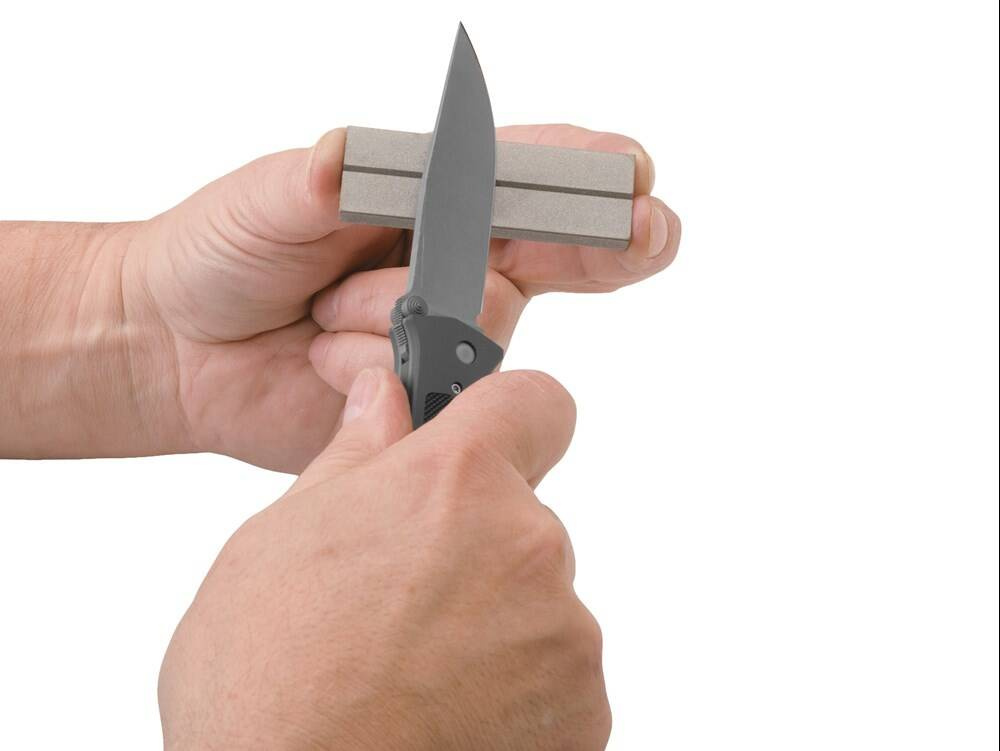 Der Stein ist verschleißfest und benötigt beim Schärfen kein Öl oder Wasser, was den Einsatz im Freien erheblich vereinfacht. Er hat eine längliche Aussparung, die sich beim Schärfen von Haken oder anderen spitzen Werkzeugen als nützlich erweist.