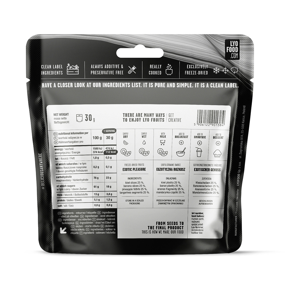 ZUTATEN & ERNÄHRUNGSWERTE: gefriergetrocknete Mandarinen 25%, Kiwi 25%, Banane 25%, Ananas 25%