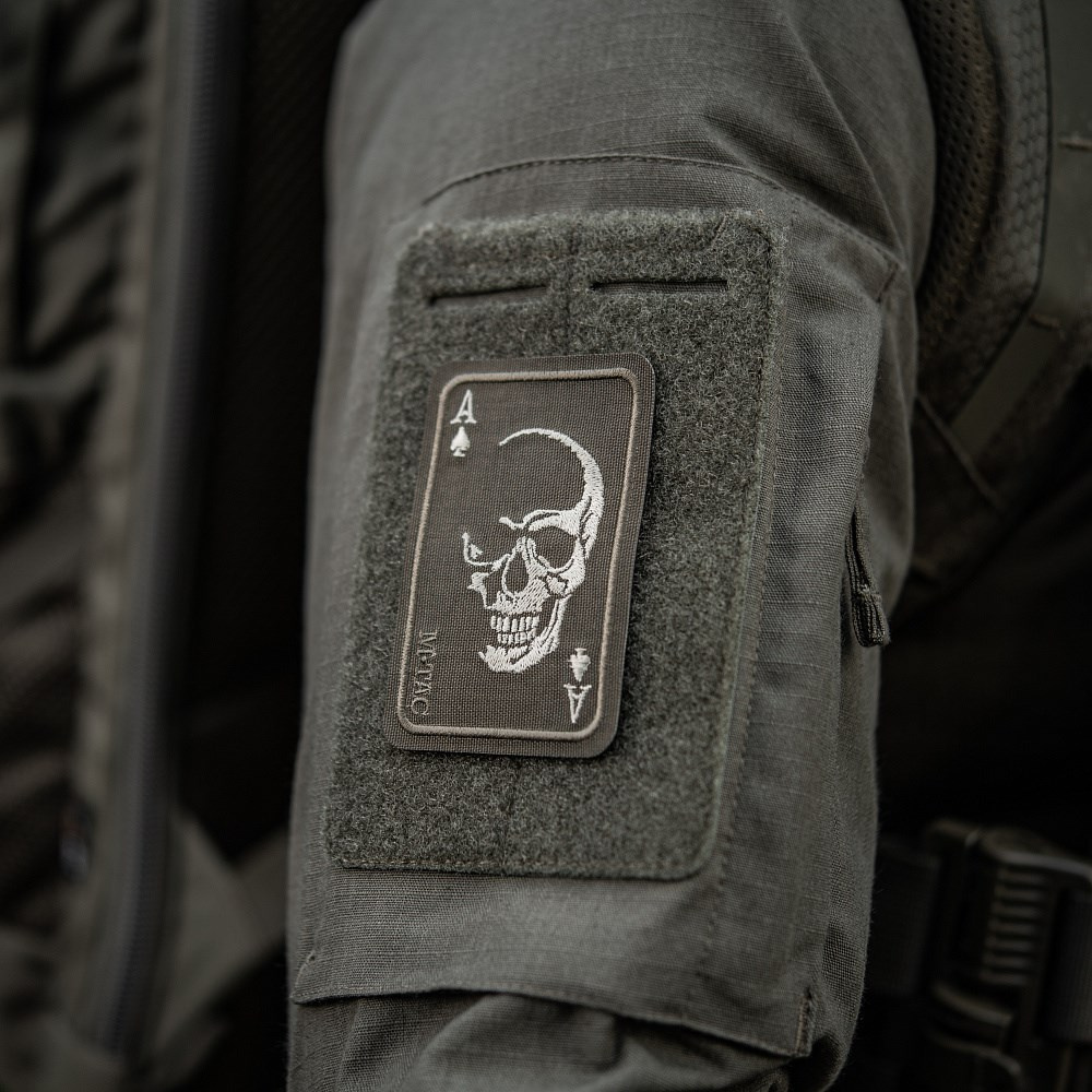 Gestickter Face of War-Aufnäher von M-Tac, der einen aus der Dämmerung auftauchenden Totenkopf darstellt. Es wurde mit der Stickmethode auf ein gesäumtes Cordura-Rechteck gestickt. Das Accessoire ist dem Pik-As nachempfunden, das traditionell als die Karte mit dem höchsten Wert im gesamten Kartenspiel gilt. Historisch gesehen wird das Motiv mit den Einsätzen der US-Armee in Vietnam und am Persischen Golf in Verbindung gebracht. Mit den Klettverschlüssen lässt sich der Aufnäher zum Beispiel an einem kompatiblen Militärrucksack befestigen.