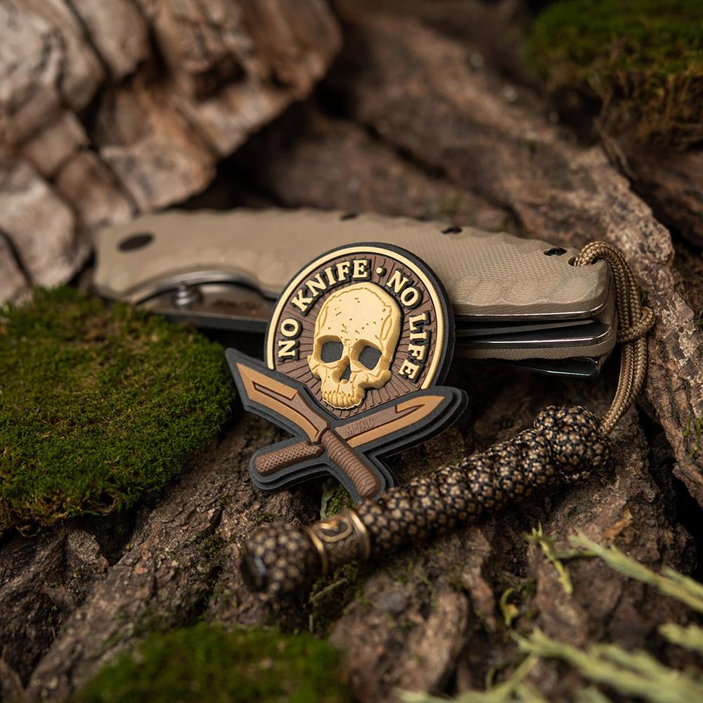 Das No Knife - No Life Patch ist das perfekte Gadget für Messerliebhaber. Dank des universellen Klettverschlusses können wir sie leicht an Militärjacken, Mützen oder anderen Accessoires anbringen, die mit entsprechenden Feldern mit Klettverschluss ausgestattet sind. Der Aufnäher hat fluoreszierende Elemente, die im Dunkeln leuchten.