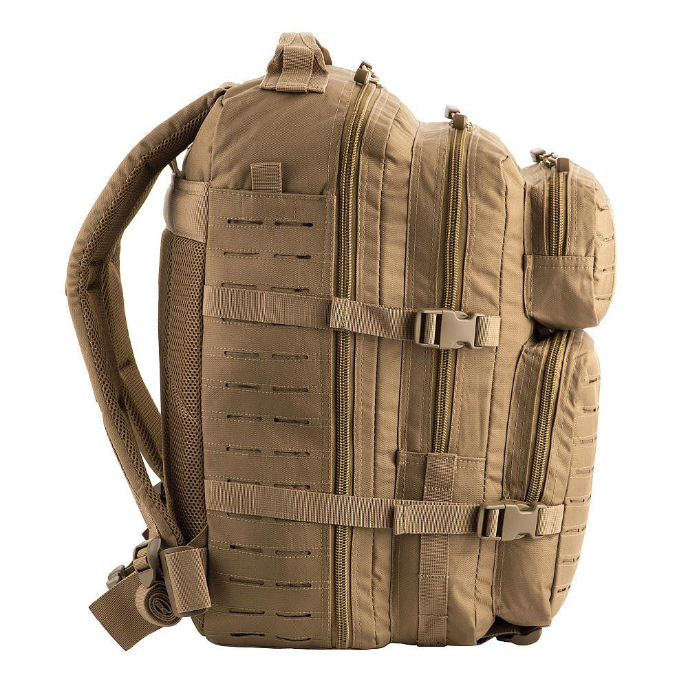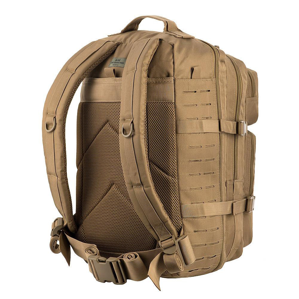M-Tac Rucksack mit Molle-Gurtsystem hat zwei große Hauptfächer mit Reißverschluss. Zwei zusätzliche Reißverschlusstaschen auf der Vorderseite. Die Riemen des Rucksacks sind weich gepolstert und verstellbar. Auf der Rückseite eine große Tasche mit atmungsaktivem Netzgewebe.