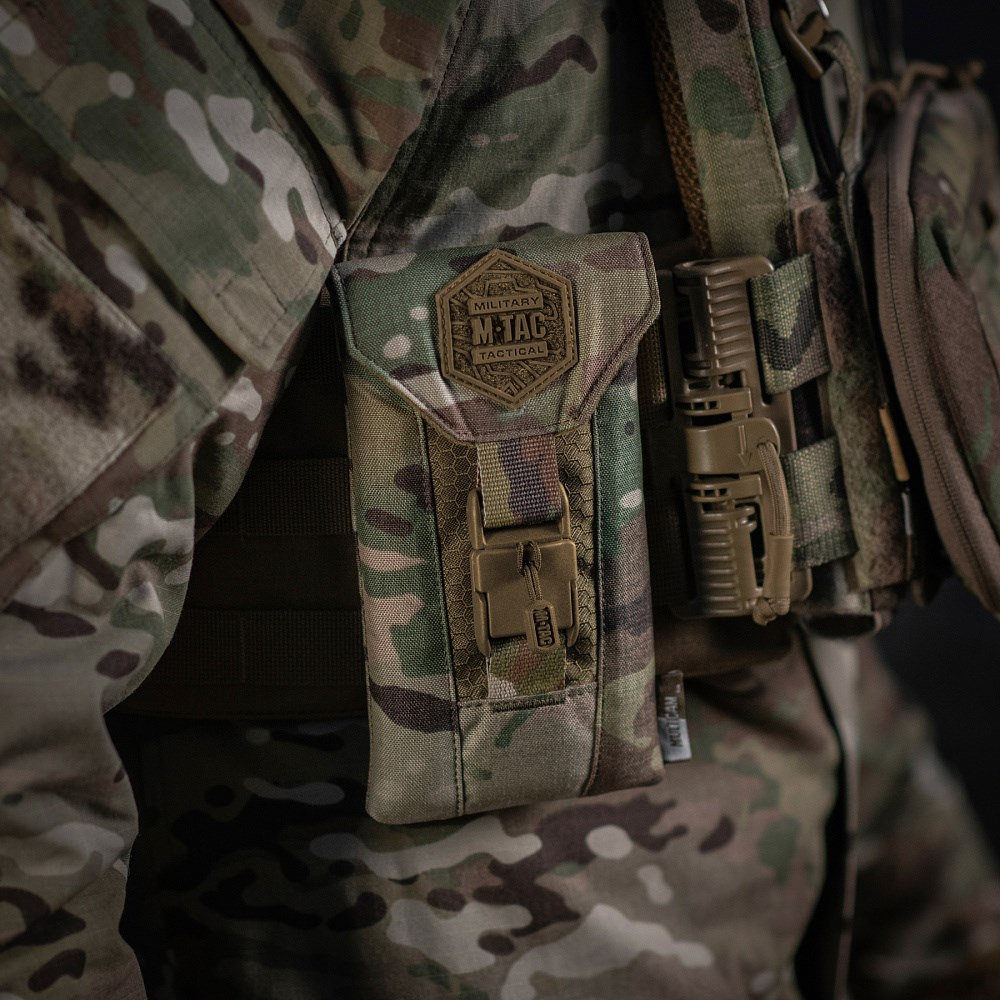 Eine Tasche für Smartphones bis zu 6,5 Zoll, hergestellt von M-Tac. Die Möglichkeit, sie direkt an einer Weste oder einem Schultergurt zu befestigen, ermöglicht einen bequemen Zugriff auf das Mobiltelefon.