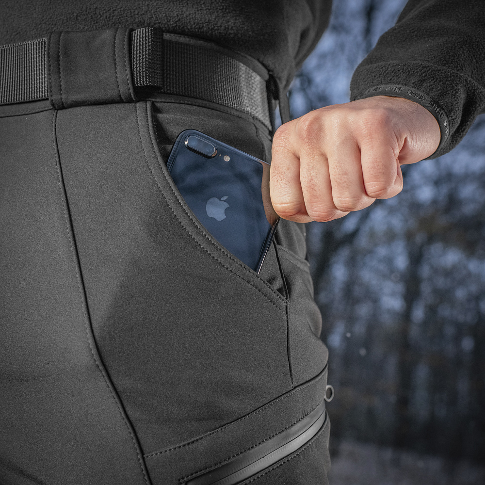 Soft Shell Winterhose von M-TAC. Das Softshell-Gewebe kombiniert die Wärmeisolierung und Atmungsaktivität von Fleece mit der Wind- und Feuchtigkeitsresistenz und Strapazierfähigkeit der Außenschicht. Die Außenseite hält den Wind ab und das Innenmaterial leitet überschüssige Feuchtigkeit ab. Wird als äußere Schicht bei raueren Bedingungen und im Winter verwendet. Für zusätzlichen Komfort in kalten Perioden hat der Hersteller ein Fleece-Futter hinzugefügt.