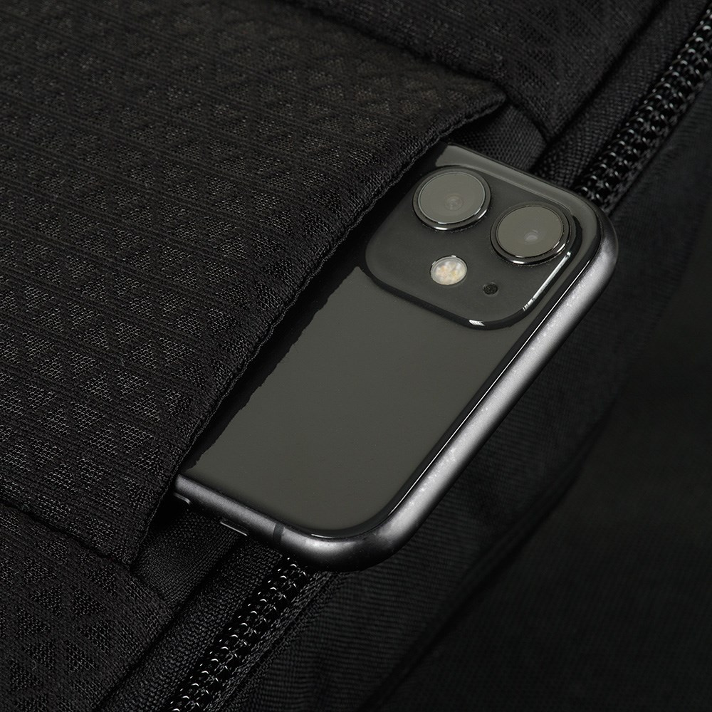 - Die Rückseite der Tasche ist mit einem luftigen Netz ausgestattet und bietet Platz für ein Smartphone