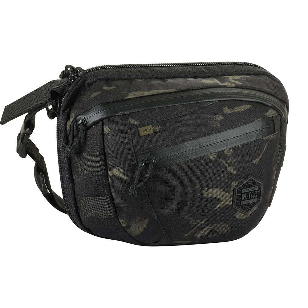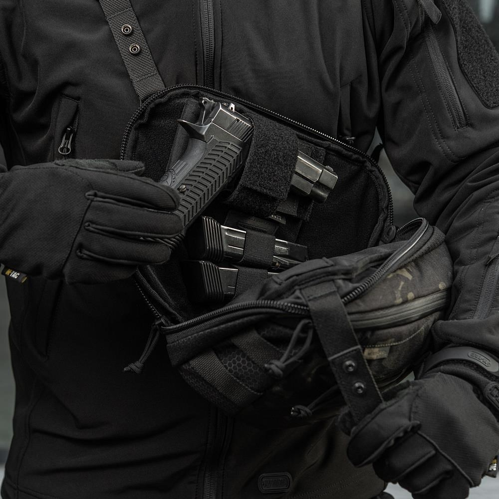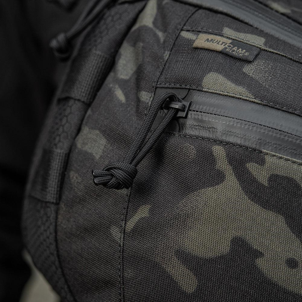 Die Sphaera Hex Hardsling Bag Large ist mit zwei geräumigen Taschen ausgestattet. Darüber hinaus befindet sich auf der Vorderseite der M-Tac-Tasche ein Klettverschlussfeld zum Anbringen von Morale Patch-Patches. Alle Taschen werden mit YKK-Reißverschlüssen verschlossen. Auf der Innenseite befindet sich eine Tasche zum Tragen eines Telefons, und an den Seiten der Tasche hat der Hersteller spezielle MOLLE-Steckplätze zum Anbringen zusätzlicher taktischer Ausrüstung angebracht.