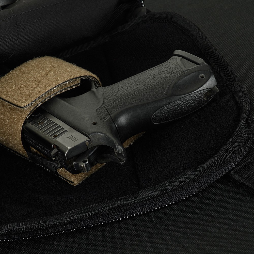 - Ausgestattet mit einem Fach für eine Handfeuerwaffe, das einen schnellen Zugriff auf die Waffe ermöglicht