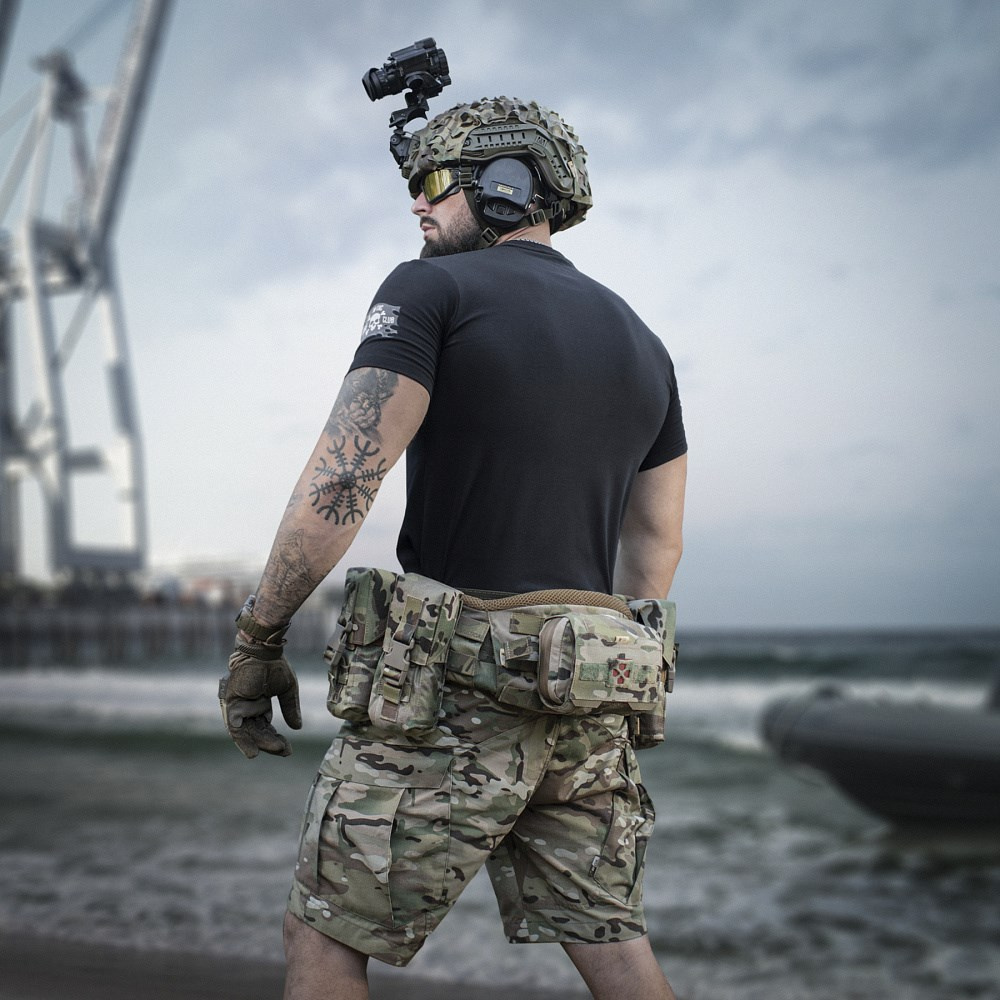 Das T-Shirt wurde mit Blick auf Komfort und Stil entworfen. Es hat einen klassischen, taillierten Schnitt und kurze Ärmel. Auf der Brust befindet sich eine auffällige, vom Film "Apocalypse Now" inspirierte Grafik, die Wellen, ein Surfbrett und einen stilisierten Special-Forces-Offizier zeigt. Auf dem linken Ärmel wiederum befindet sich ein Aufdruck der "Jolly Roger"-Flagge. Das T-Shirt eignet sich perfekt für den täglichen Gebrauch, vor allem in Kombination mit einer taktischen Hose oder einem militärischen Sweatshirt.