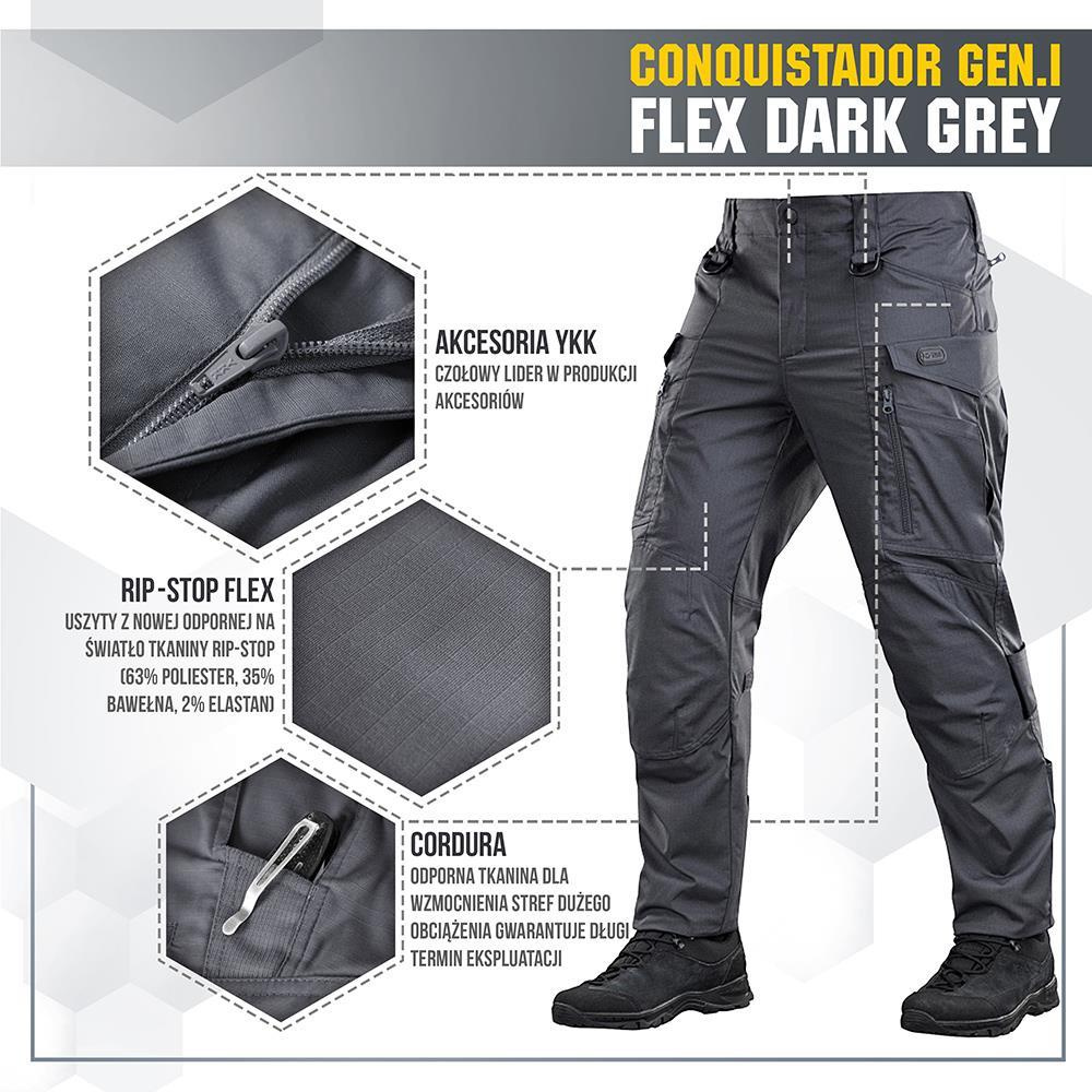 Ein Designmerkmal der Conquistador Flex Hose ist ein Einsatz aus elastischem Material an der Taille und im Bereich der Seitentaschen der Hose, dank dem die Hose beim Vorbeugen und Bücken nicht stört. Sie schränken die Bewegung nicht ein und können sowohl taktische als auch alltägliche Bekleidungsaufgaben problemlos ausführen. Der Hosengürtel wird mit einem Reißverschluss und einem Knopf geschlossen, ausgestattet mit Gürtelschlaufen bis zu 5,5 cm Breite. An der Vorderseite des Gürtels sind zwei D-Ringe eingenäht, um verschiedene Ausrüstungsgegenstände zu befestigen.