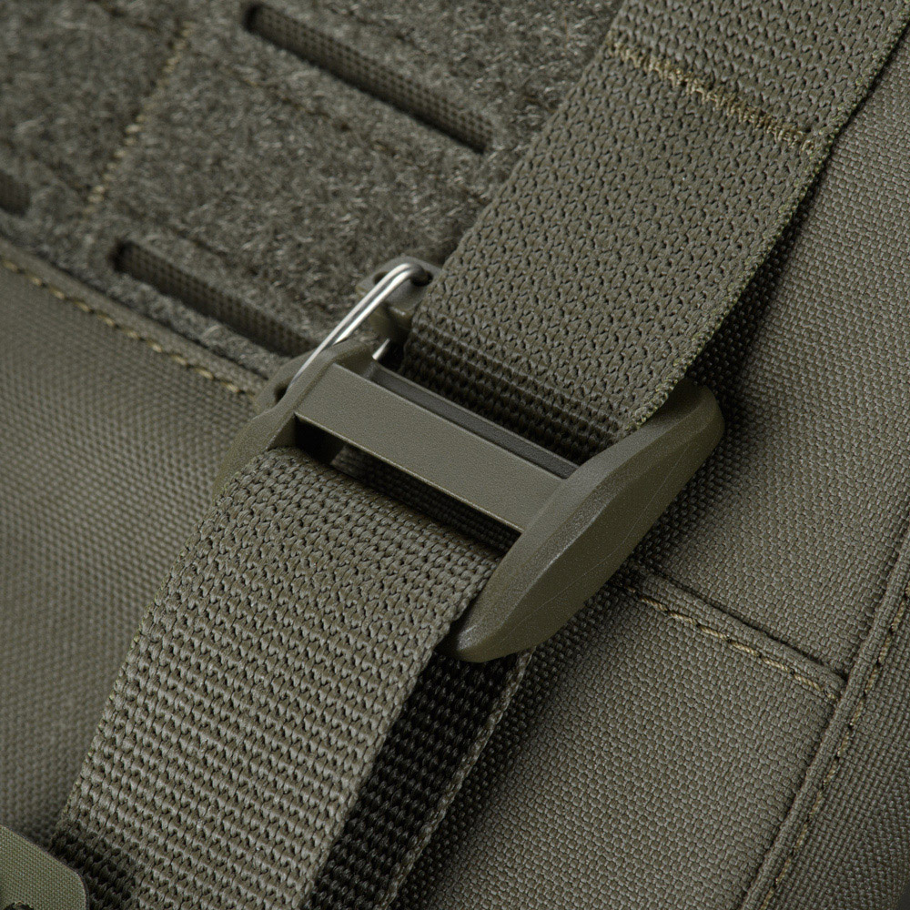 Interne Belüftungspaneele sorgen für eine effektive Luftzirkulation und erhöhen den Tragekomfort auch bei langem Tragen. Die M-Tac-Weste ist für ESAPI-Standard-Ballistikplatten in Größe L geeignet. Das Verstellsystem an Schultern und Taille ermöglicht eine präzise Passform. Der Überwurf verfügt über ein Verwaltungsfach, 3 AR/AK-Karabinertaschen und einen Fluchtgriff.