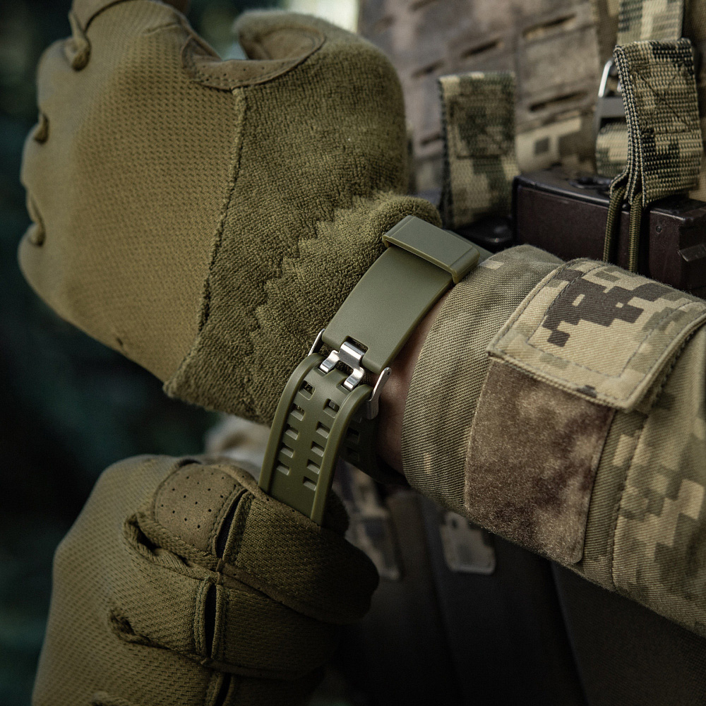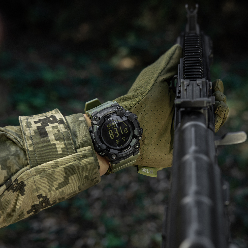 Die taktische Uhr 2037 mit aufgebautem Gehäuse verleiht der Uhr von M-Tac einen sportlichen Touch. Wie ähnliche Uhren des Unternehmens verfügt sie über eine breite Funktionalität und eine ABS-Polymer-Hülle mit erhöhter Widerstandsfähigkeit gegen Beschädigungen. Das Gerät verfügt über viele weitere Funktionen als nur die Zeitmessung, darunter eine Stoppuhr, das Datum, einen Kompass oder einen Schrittzähler.
