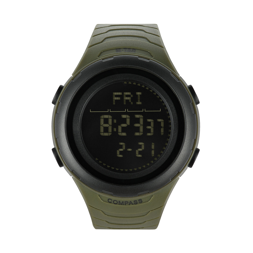 Die taktische Uhr 2166 mit einem flachen Gehäuse von M-Tac. Wie ähnliche Uhren des Unternehmens verfügt sie über eine breite Funktionalität und ein ABS-Polymer-Gehäuse mit erhöhter Widerstandsfähigkeit gegen Beschädigungen. Das Gerät verfügt über viele weitere Funktionen als nur die Zeitmessung, darunter eine Stoppuhr, das Datum, einen Kompass und einen Schrittzähler.