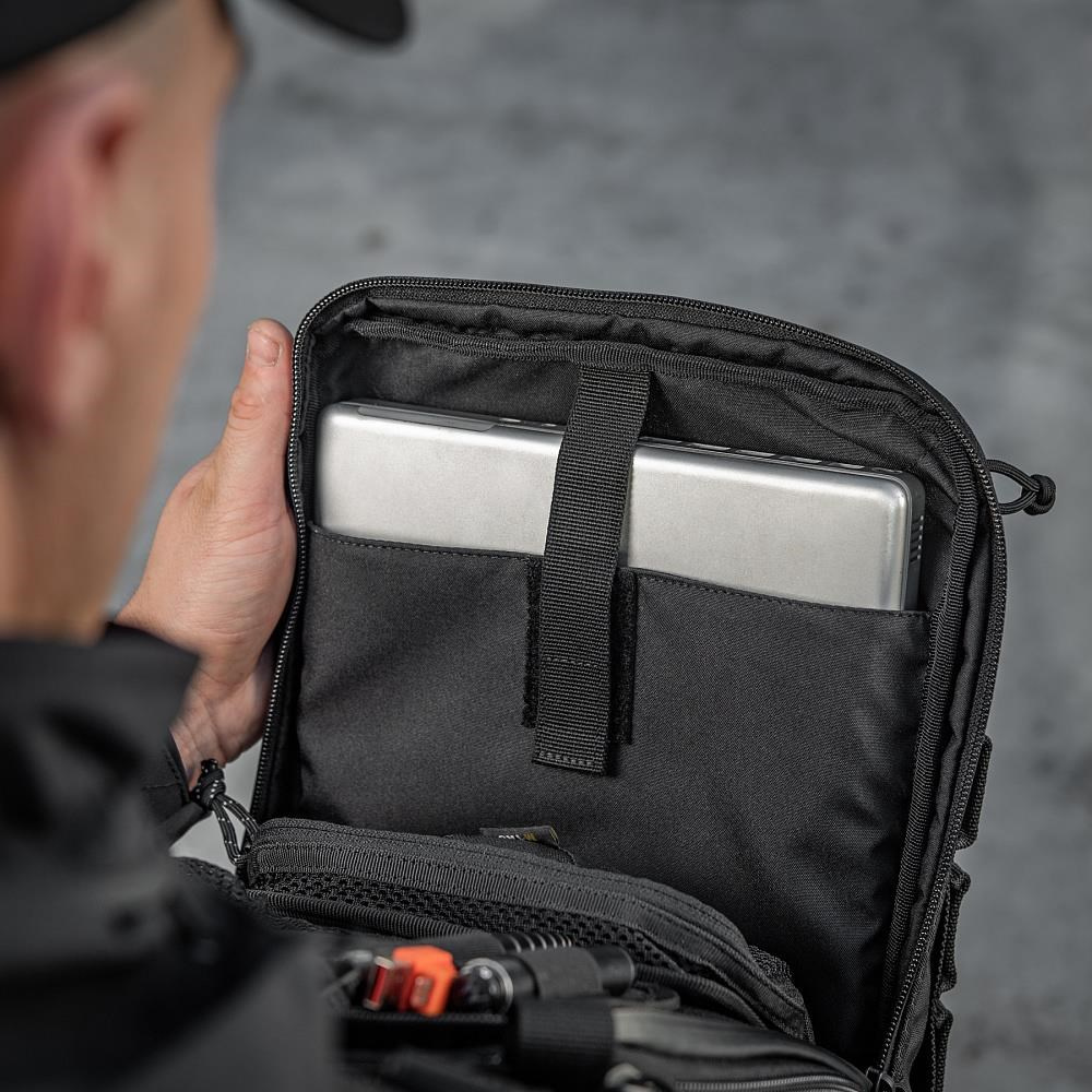 Die Tasche hat wasserdichte Reißverschlüsse von YKK, um den Inhalt vor Regen und Schnee zu schützen. An der Vorderseite der Tasche befindet sich eine Klettverschlussplatte, an der z. B. Aufnäher befestigt werden können. Die Tasche ist mit einer Fastex-Schnalle und einem verstellbaren Schultergurt ausgestattet, so dass sie sich an jeden Benutzer anpassen lässt. Sie kann problemlos in Verbindung mit einer taktischen Jacke getragen werden.