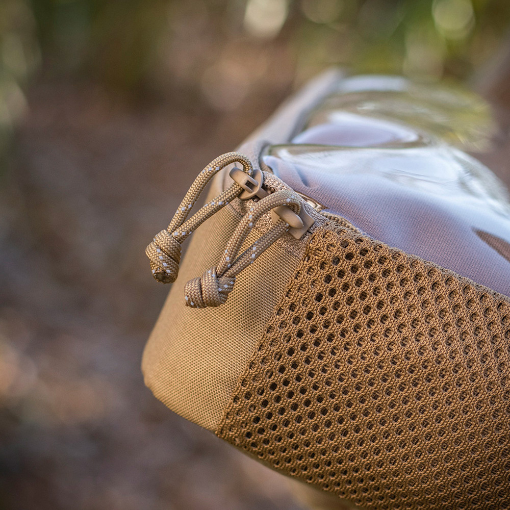 Die Tasche ist aus 500D Cordura-Gewebe gefertigt und behält ihre Form und verformt sich nicht, wenn sie Feuchtigkeit ausgesetzt wird. Eine Frontplatte aus transparentem PVC ermöglicht es Ihnen, den Inhalt schnell zu identifizieren, ohne den Organizer zu öffnen, und die Innenseite verfügt über eine Klettplattform, an der Sie zusätzliche Taschen und Zubehörteile anbringen können.