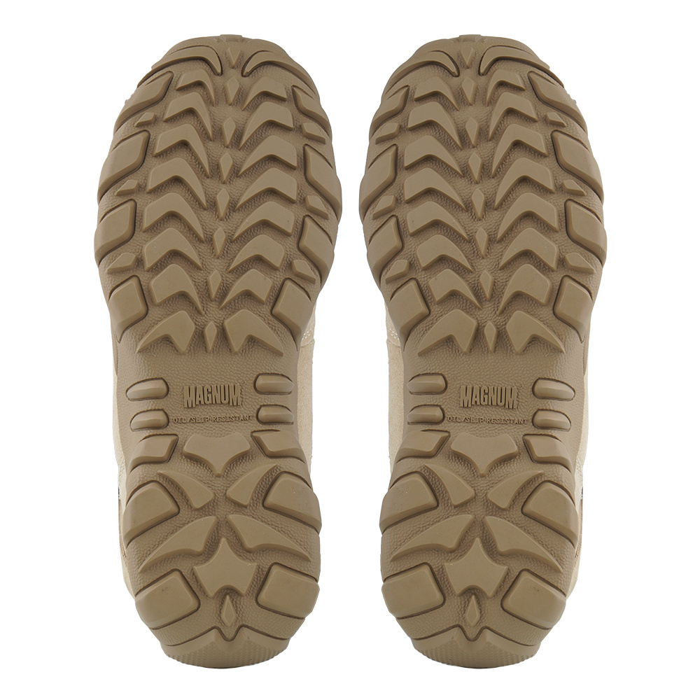 Haltbarer halbhoher Militärstiefel von Magnum. Sie bestehen aus strapazierfähigem Wildleder in Kombination mit 900D Nylon. Ihre Konstruktion war frei von Metallelementen. Für Komfort und Hygiene sind antibakterielle Innenfutter verantwortlich.