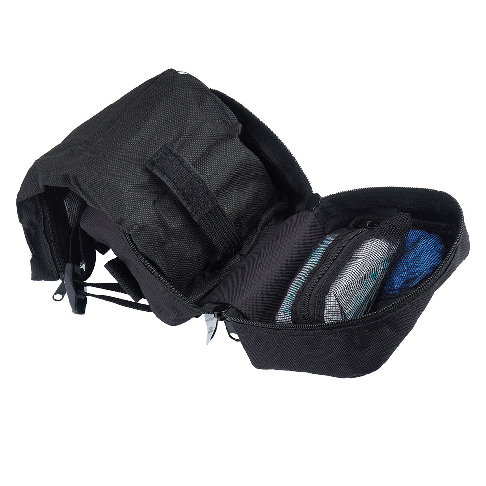Ein spezielles Gurtsystem ermöglicht die Befestigung an einem Gürtel, Rucksack, Fahrrad usw. Das Ganze wurde aus strapazierfähigem Material mit Cordura-Eigenschaften hergestellt, wobei auf Ästhetik und ergonomische Anordnung der Verbandsmaterialien geachtet wurde. Dank der Verwendung von verschließbaren Taschen bleibt die Erste-Hilfe-Ausrüstung an ihrem Platz, nachdem sie geöffnet und aufgeklappt wurde. Das Mesh-Innenleben ermöglicht ein schnelles Auffinden des benötigten Verbandsmaterials.