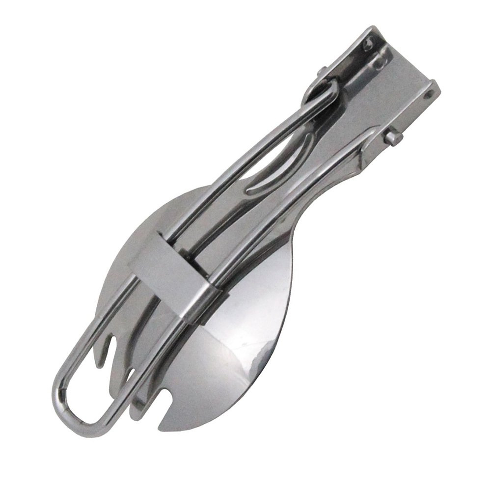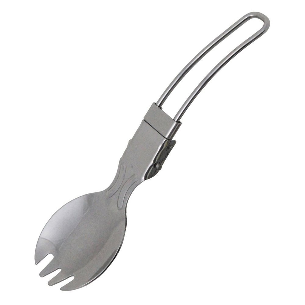 Der Anwender erhält eine Kombination aus Löffel und Gabel mit faltbarem Griff, um Platz im Rucksack zu sparen. Ein Schloss im Griff verhindert das Selbstschließen während des Gebrauchs.