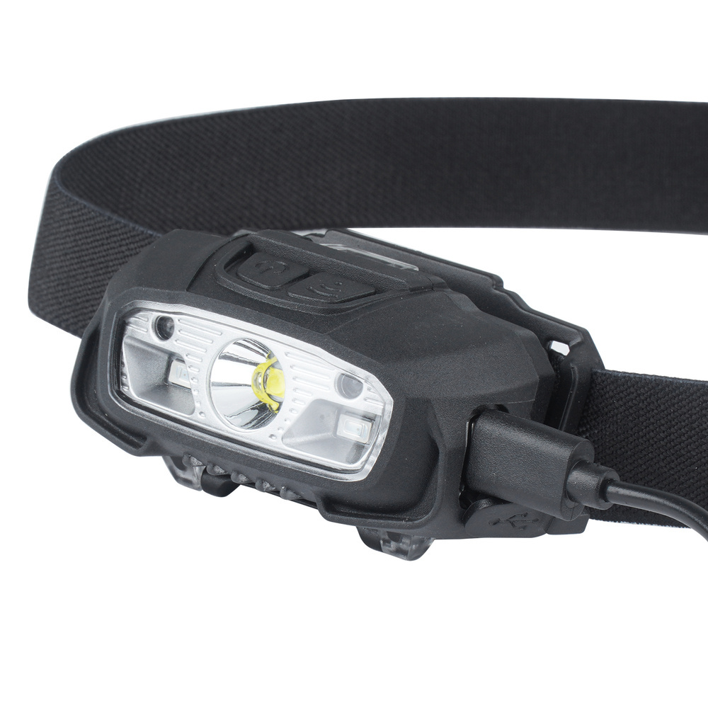 Das robuste Gehäuse besteht aus strapazierfähigem, gummibeschichtetem Verbundmaterial. Dank ihrer geringen Größe passt sie problemlos in ein EDC-Kit, das in einer Hüfttasche aufbewahrt wird. Die Taschenlampe am Kopf ist mit einem verstellbaren, bequemen Band aus elastischem Stoff befestigt.