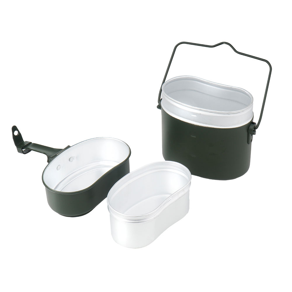 Militärischer 3-teiliger Mess-Tin aus anodischem Aluminium in olivgrüner Farbe.