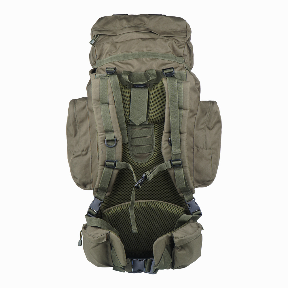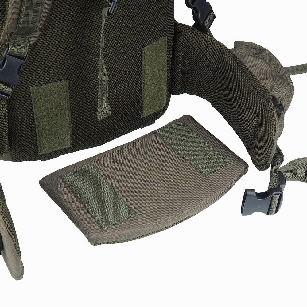 Der Rucksack hat verstellbare Schultergurte und einen Brustgurt sowie eine abnehmbare Beckenpolsterung für zusätzlichen Komfort. Am Hüftgurt befinden sich zwei Reißverschlusstaschen, und die gesamte Struktur ist mit einem Aluminiumrahmen verstärkt.