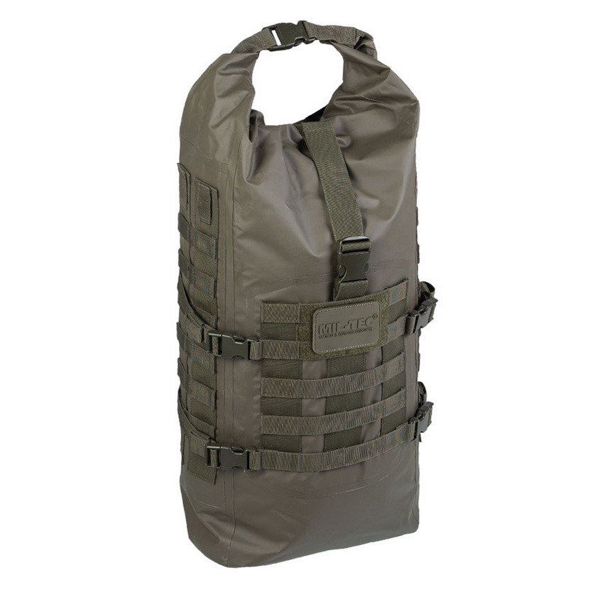 - Wasserdichter Rucksack aus PVC, schaumstoffgefüttert. Schützt vor Regen, Spritzwasser und sogar vor kurzen Tauchgängen. Molle-Befestigungsbänder, Patch-Panel, Kompressionsbänder. Bequeme, verstellbare Hosenträger. Farbe oliv.