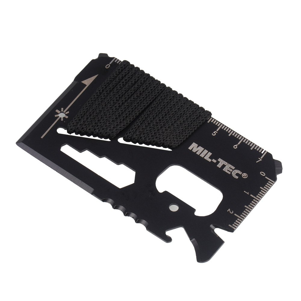 - Praktisches Multitool mit Abmessungen und Form einer Geldautomatenkarte. Aus rostfreiem Stahl gefertigt, verfügt es über eine ganze Reihe von nützlichen Funktionen und Werkzeugen sowie eine Paracord-Schnur.