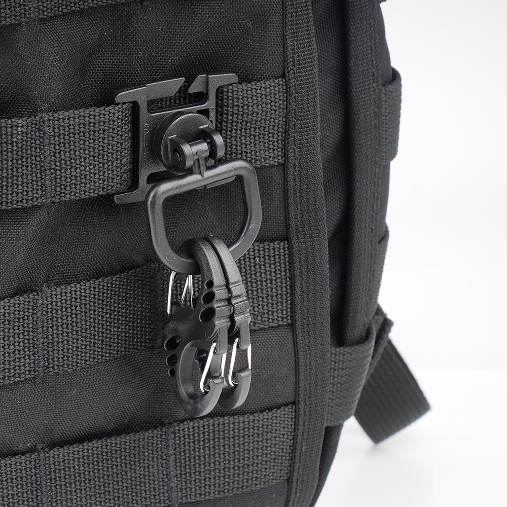 • Griffe aus Duraflex, befestigt an Molle-Bändern, mit Doppelverschlusskarabinern. Sie ermöglichen die einfache Befestigung von zusätzlichen Elementen an der Ausrüstung. Farbe OD Green.