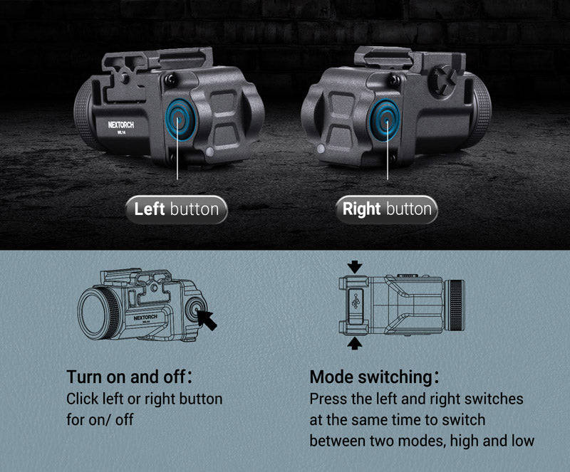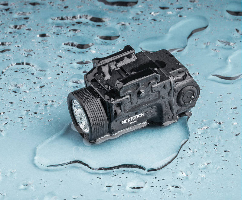 Die Taschenlampe ist aus strapazierfähigem Kunststoff gefertigt und widersteht Stürzen aus einer Höhe von 1 m. Darüber hinaus ist sie nach IPX7 wasserdicht. Dank des doppelseitigen Drehschalters ist die WL14 sowohl für Links- als auch für Rechtshänder geeignet. Die Taschenlampe verfügt über eine Picatinny 1913- und eine Glock-Standardhalterung, wodurch sie mit den meisten auf dem Markt erhältlichen Pistolen kompatibel ist.