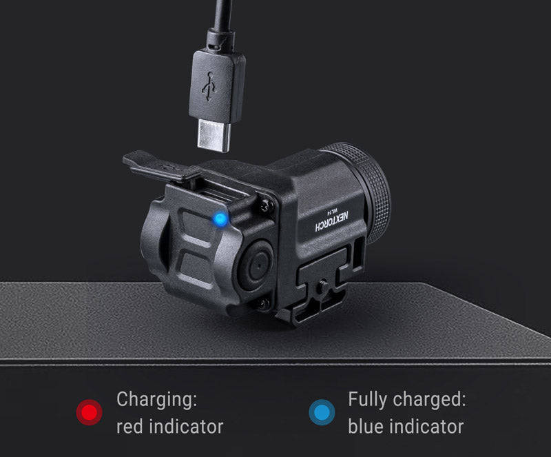 Kompakte Pistolen-Taschenlampe mit Glock- und Picatinny-Standard-Montage mit 500 lm und einer Reichweite von 115 m für bis zu ca. 2,5 h Dauerbetrieb. Die Stromquelle für die Taschenlampe ist ein wiederaufladbarer 16340-Akku oder eine CR1234A-Batterie über ein USB-C-Kabel (im Lieferumfang enthalten).
