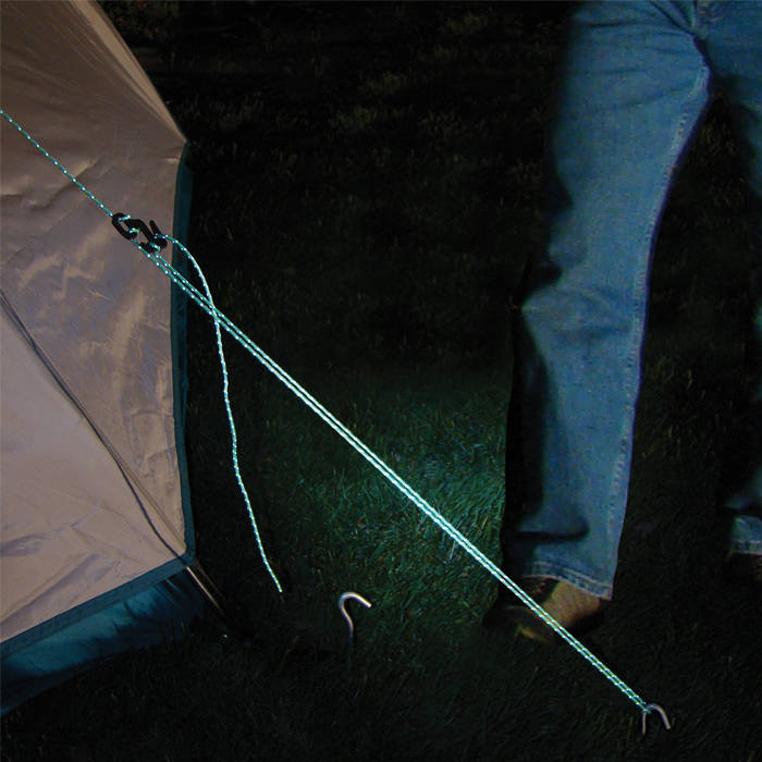 Reflektierende Zeltschnur, hergestellt von Nite Ize. Es eignet sich ideal zum Aufspannen eines Zeltes auf einem Campingausflug und verringert dank seiner reflektierenden Eigenschaften die Stolpergefahr bei Dunkelheit. Kleine Punkte entlang der Linie reflektieren effektiv das Licht von Taschenlampen, Scheinwerfern und Lampen.