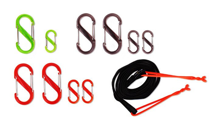 • Ein Set aus S-Bindern und Gear-Tie, die in Kombination mit einer flexiblen Leine das Aufhängen, Trocknen und Aufbewahren Ihrer Sachen im Zelt und im Gelände ermöglichen.