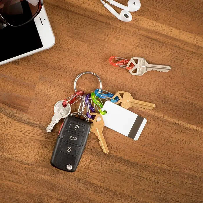 - Set bestehend aus sechs kleinen S-Biner® Karabinerhaken aus farbigem Kunststoff und einem widerstandsfähigen Schlüsselring aus Edelstahl. Zusammen bilden sie einen praktischen Organizer, mit dem Sie Ihre Schlüssel geordnet aufbewahren können.