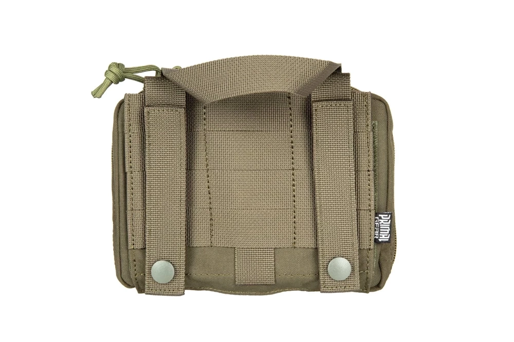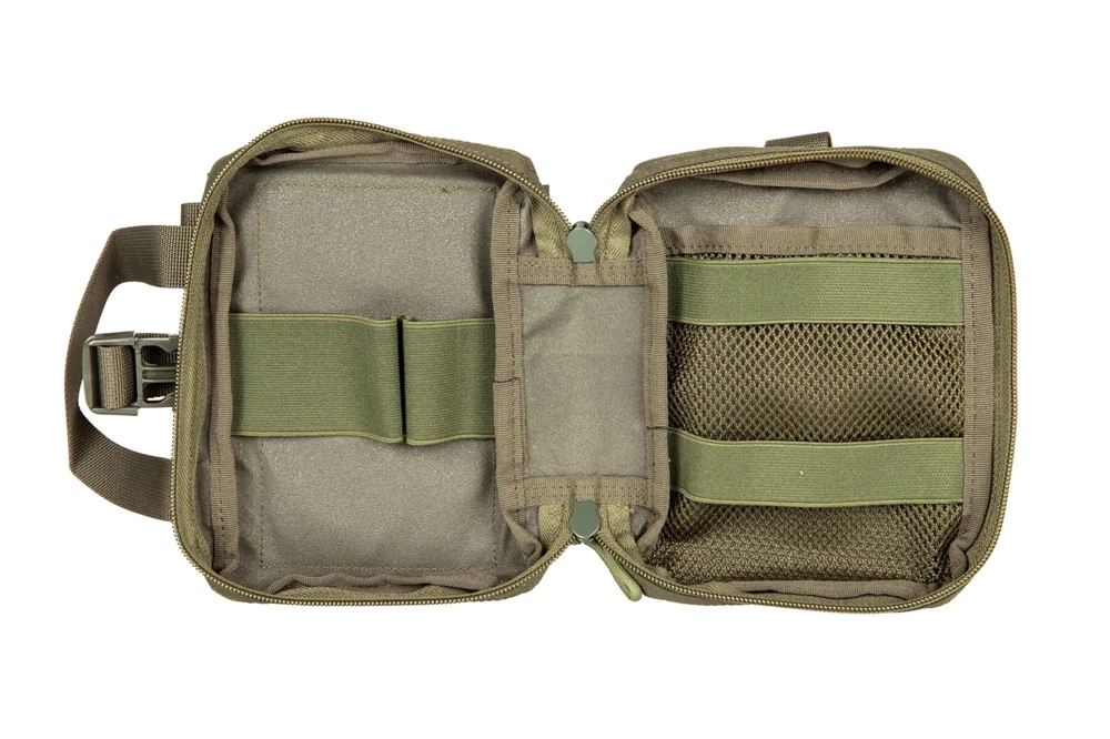 Die Erste-Hilfe-Tasche wird zusätzlich mit Schnallenband gesichert. An der Vorderwand des Verbandskastens befindet sich eine kleine flache Tasche, die mit Klettverschluss verschlossen wird, und eine kleine Klettfläche, z.B. für ein Moralabzeichen. Das Design des Tabletts ist sehr vielseitig, sodass es sich sowohl als Erste-Hilfe-Kit als auch als EDC-Tasche eignet.