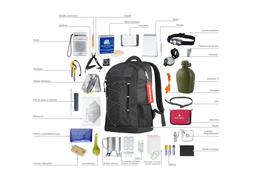 Ein erweiterter Evakuierungsrucksack, der es Ihnen ermöglicht, in einer Notsituation effizient von einem gefährlichen Ort zu entkommen. Das Fassungsvermögen des Rucksacks selbst beträgt 18 L, was es Ihnen ermöglicht, zusätzliche Ausrüstung mitzunehmen, zusätzlich zu der, die im Kit enthalten ist. Der Rucksack hat laut der MON-Liste bis zu 22 Gegenstände. Dank ihnen kann der Benutzer im Falle einer lebensbedrohlichen Situation lange Zeit ohne fremde Hilfe überleben.
