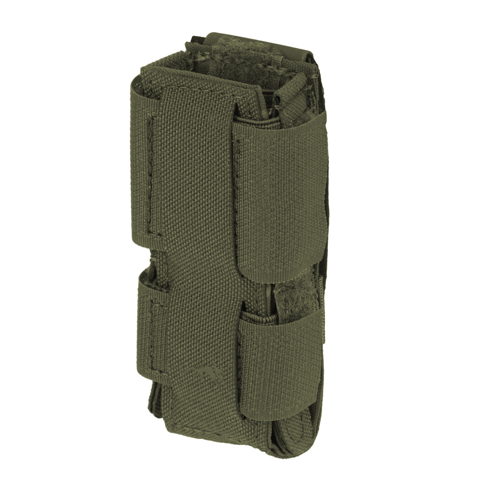 Pistolentasche, kompatibel mit den meisten doppelreihigen Magazinen für Handfeuerwaffen. Das verwendete MOLLE-System ermöglicht eine einfache Befestigung an einem Schießgürtel oder einer taktischen Weste. Der seitliche Stabilisator, der mit Klettverschluss befestigt wird, erhöht die Steifigkeit des Laders, so dass er seine Form auch nach der Entnahme des Magazins beibehält.