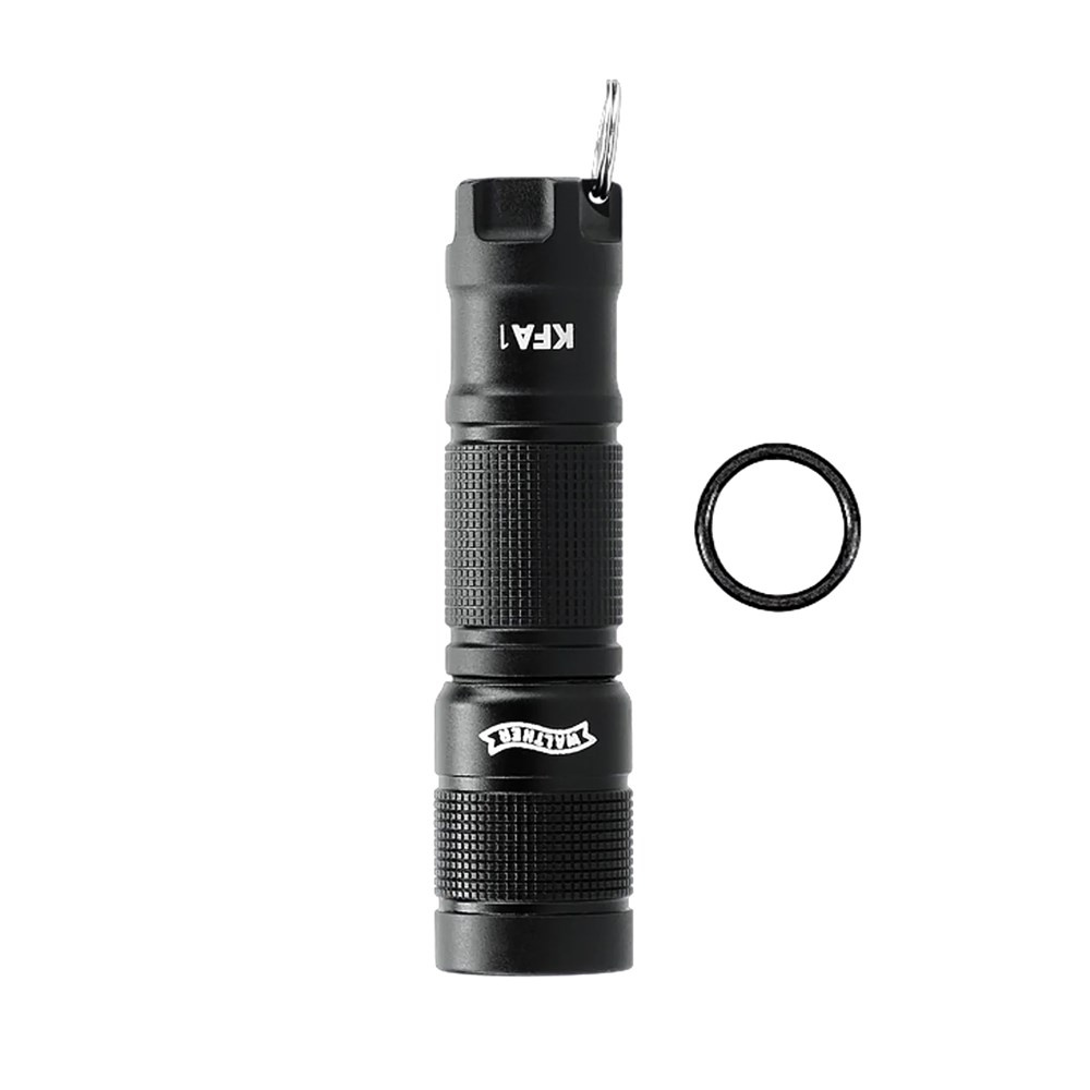 Schlüsselanhänger-Taschenlampe KFA1 von der bekannten Firma Walther. Es handelt sich um ein handliches Gerät, das in seiner Form seinen großen Vorbildern nachempfunden ist. Dank ihrer kompakten und leichten Bauweise ist sie am Schlüsselbund praktisch nicht mehr zu spüren. Der integrierte Schlüsselring in der Fußplatte der Taschenlampe ermöglicht es Ihnen außerdem, die Taschenlampe schnell an einen Karabinerhaken zu hängen.
